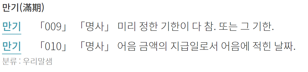 같은 방식으로 만기의 뜻을 사전에서 찾아보면 만기는 보험을 보장받는 시기라는 것을 알 수 있습니다.