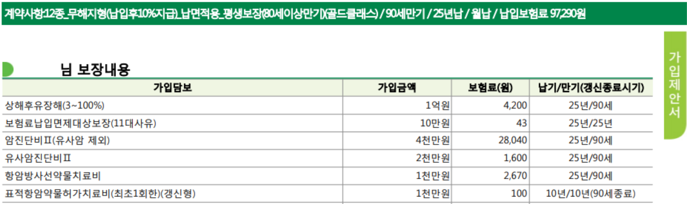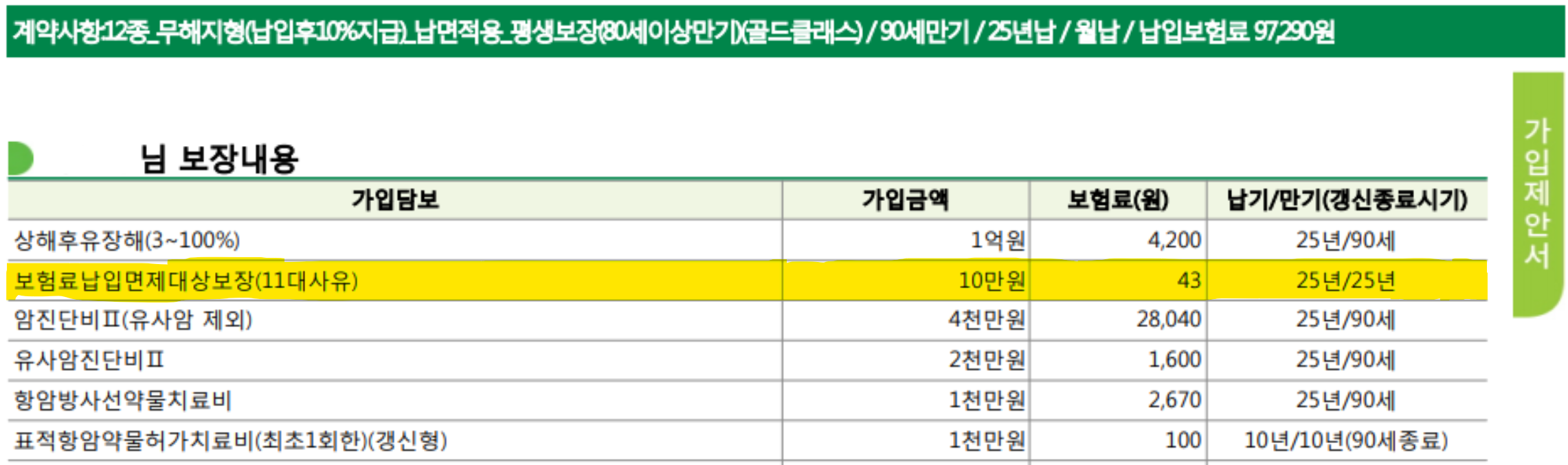 즉, 25년납인 보험은 26년차부터 보험료를 낼 필요가 없기 때문에 25년까지만 보장되면 되는 것이고, 혹시라도 보험을 내는 25년 동안의 기간에 약관에서 지정한 11가지 질병에 걸리거나 상해를 입으면 향후 보험료를 내지 않아도 된다는 것이죠.