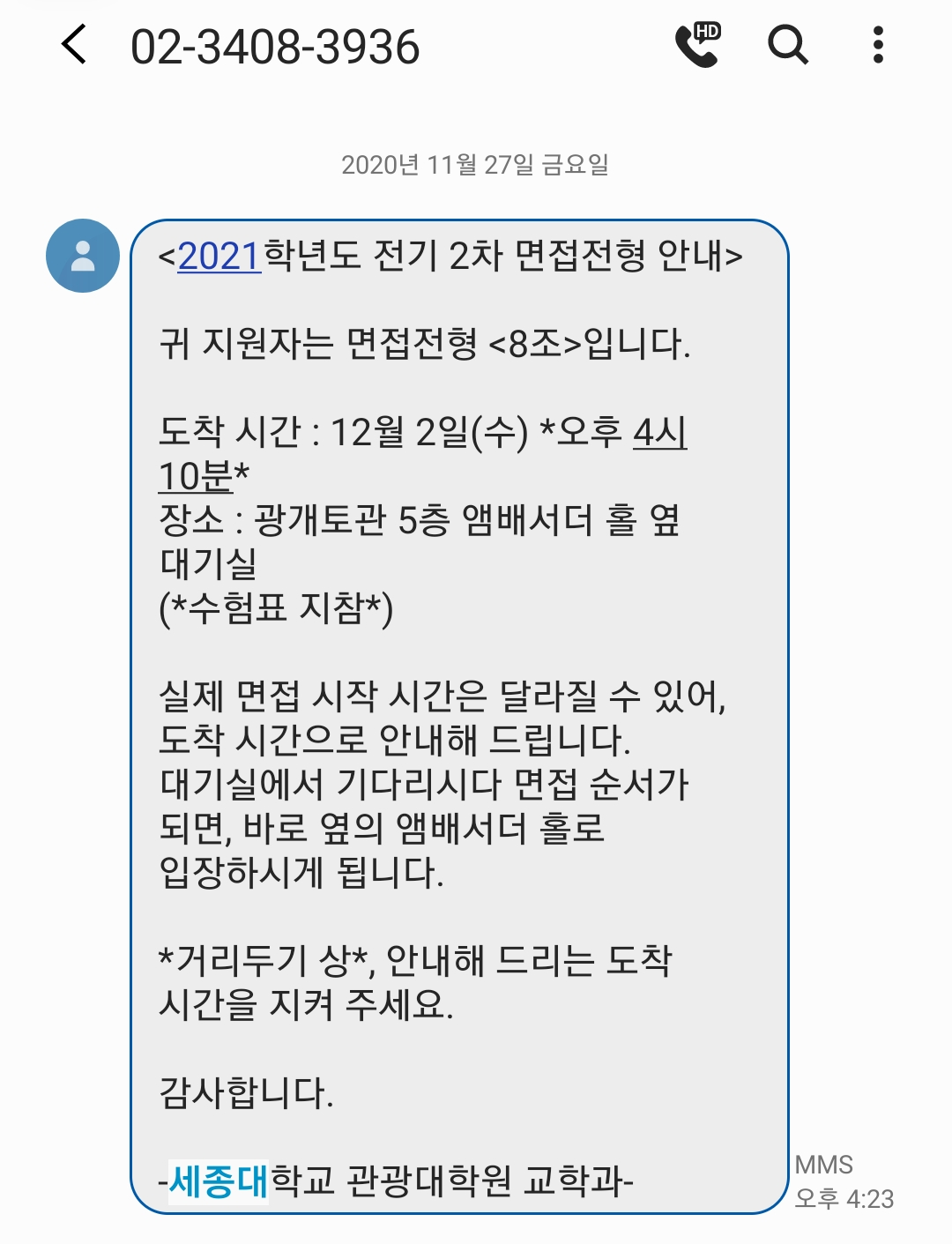 면접은 세종대에서 지정한 '전형일시'날에 진행하게 됩니다.