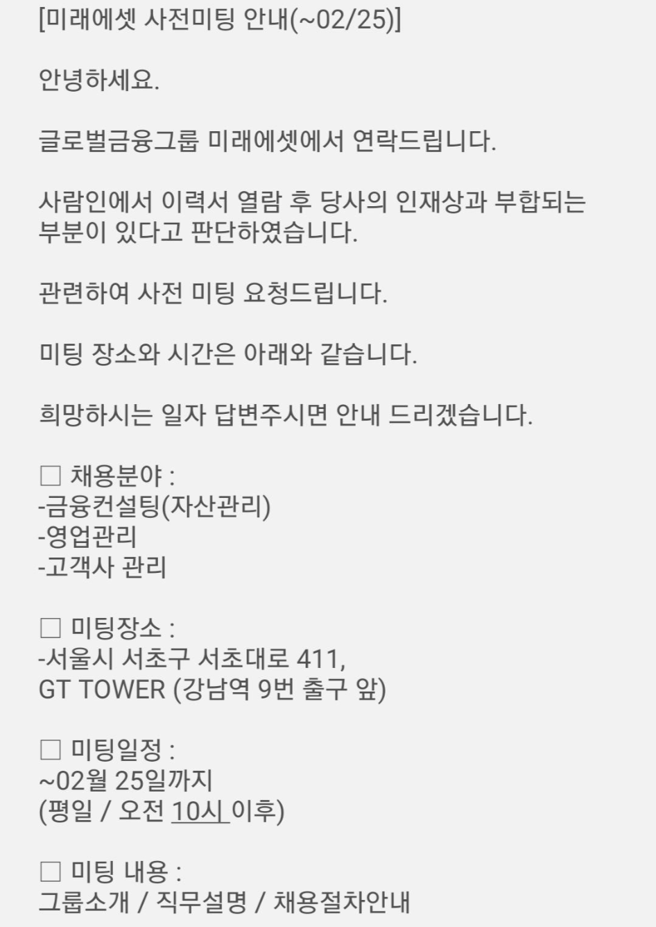 분명 사람인에 적어놓은 모든 경력은 호텔관련이었는데 갑자기 미래에셋에서 연락이라니!