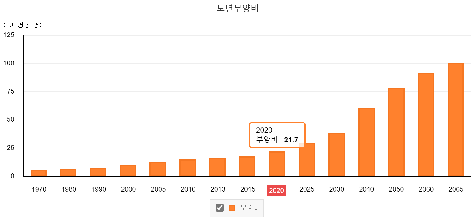 즉, 부양비가 100명당 20명이라는 뜻은 100명의 생산가능인구가 20명의 고령인구를 먹여살린다는 뜻이지요.