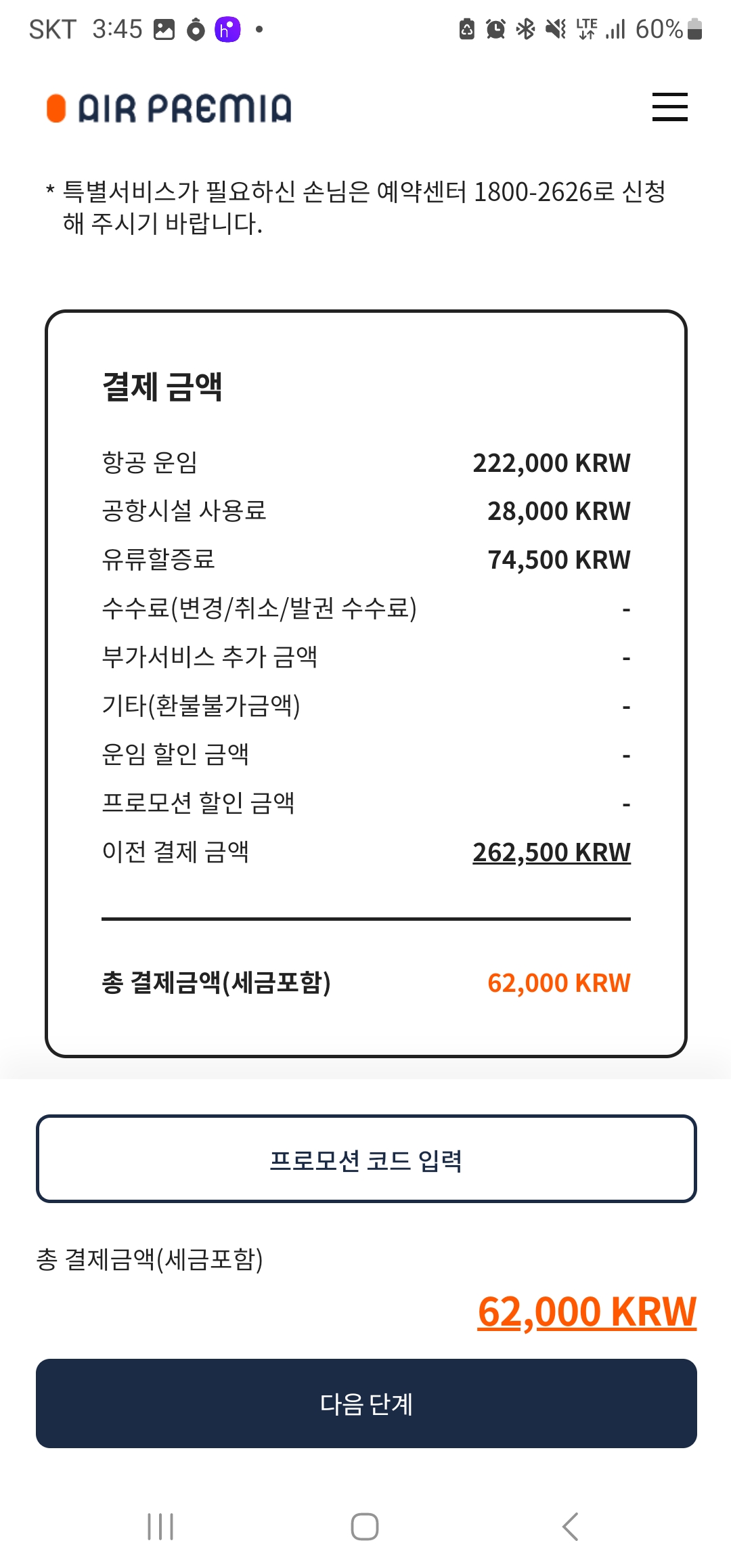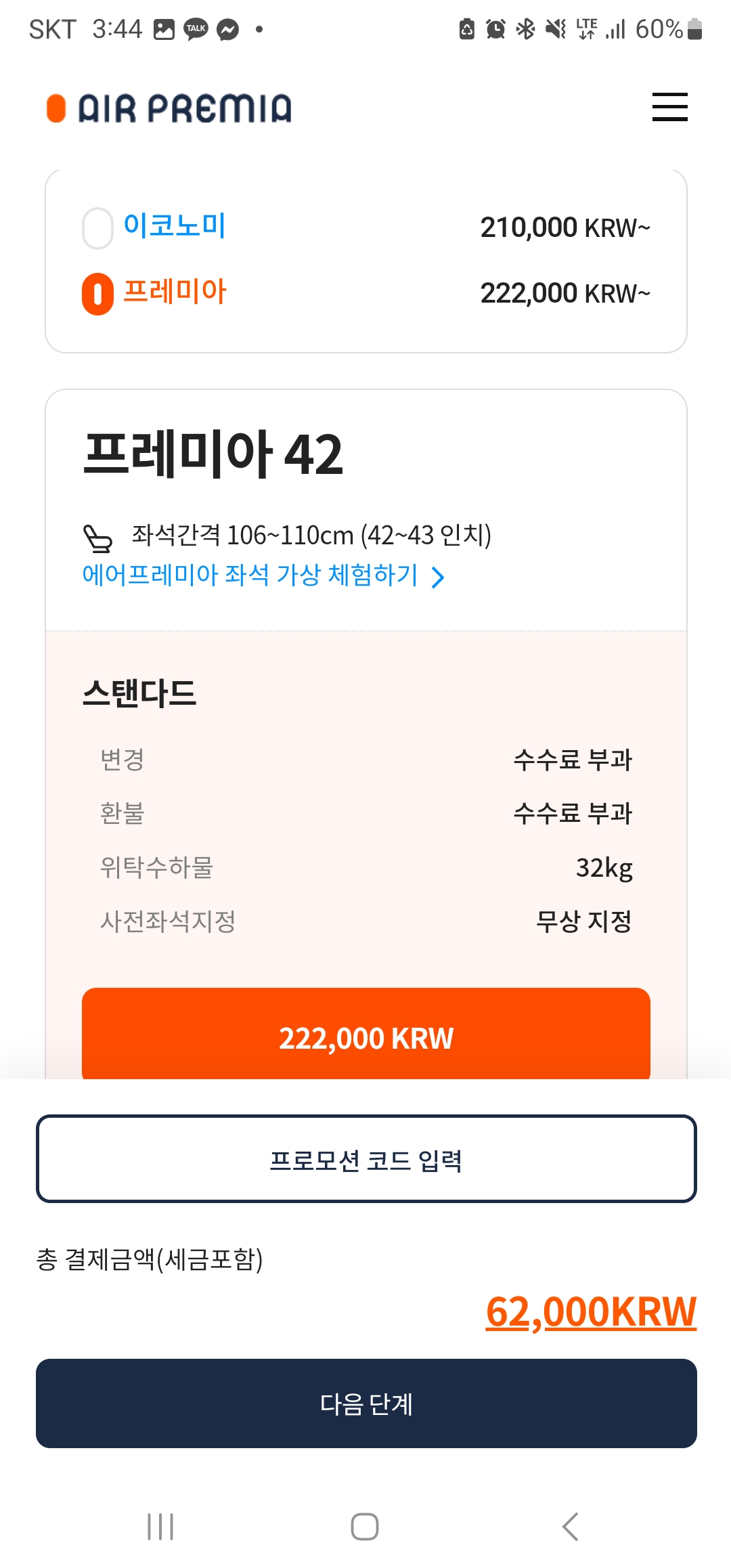 에어프레미아에서는 업그레이드 비용이 6.2만원밖에 안돼서 신기했습니다.