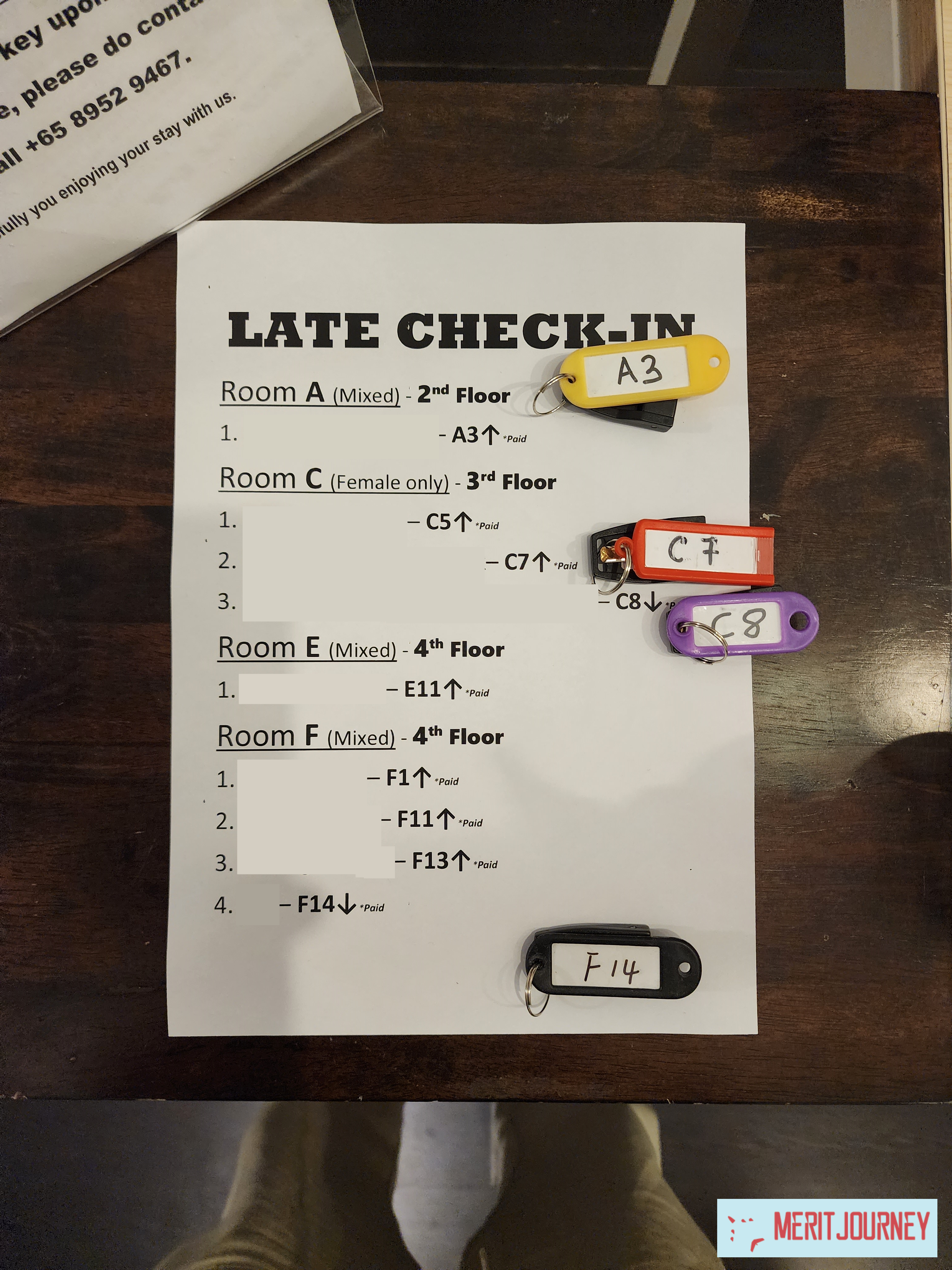 그리고 2층에 들어가면 Late Check-in하는 인원들의 정보가 쓰여있고, 해당하는 키를 가져가서 자신의 물품 잠그는 용도로 활용하면 됩니다.