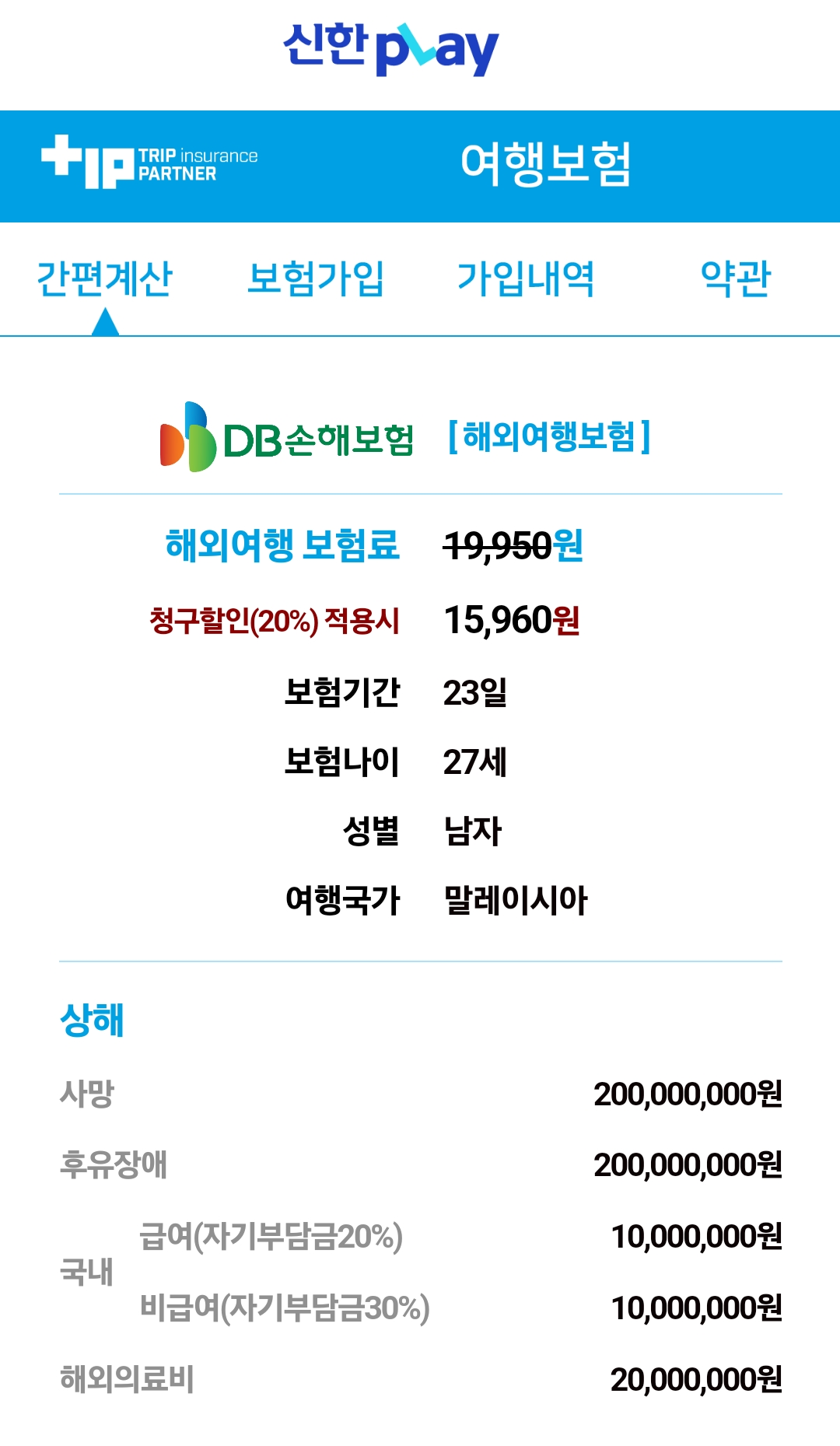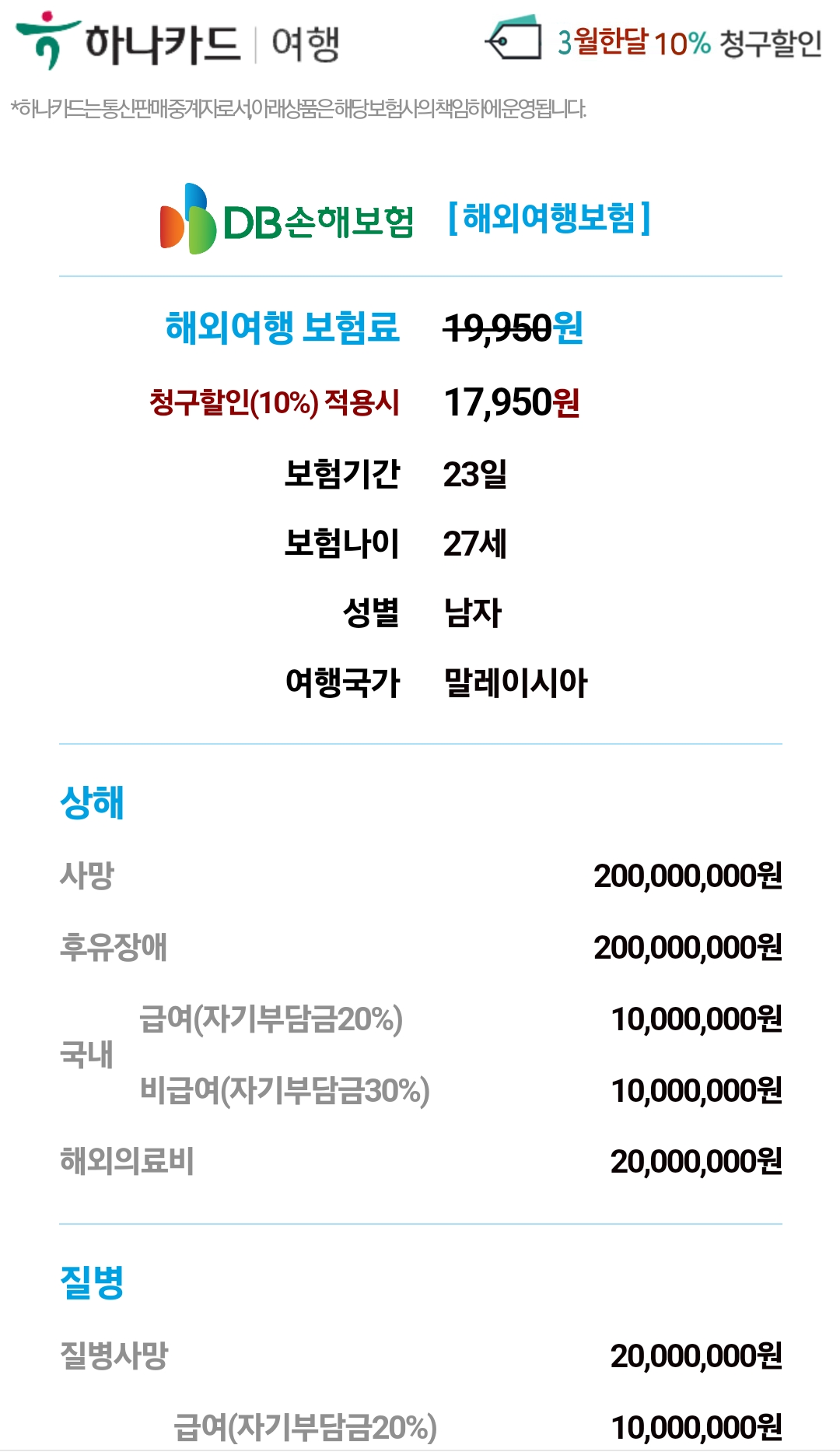 사실 이때가 해외 출국 2~3일쯤 전이었어서 보험을 찾아보고 있었는데 마침 하나카드는 10%, 신한카드는 20%를 할인해주고 있어서 바로 신한카드로 계약을 체결했었습니다.