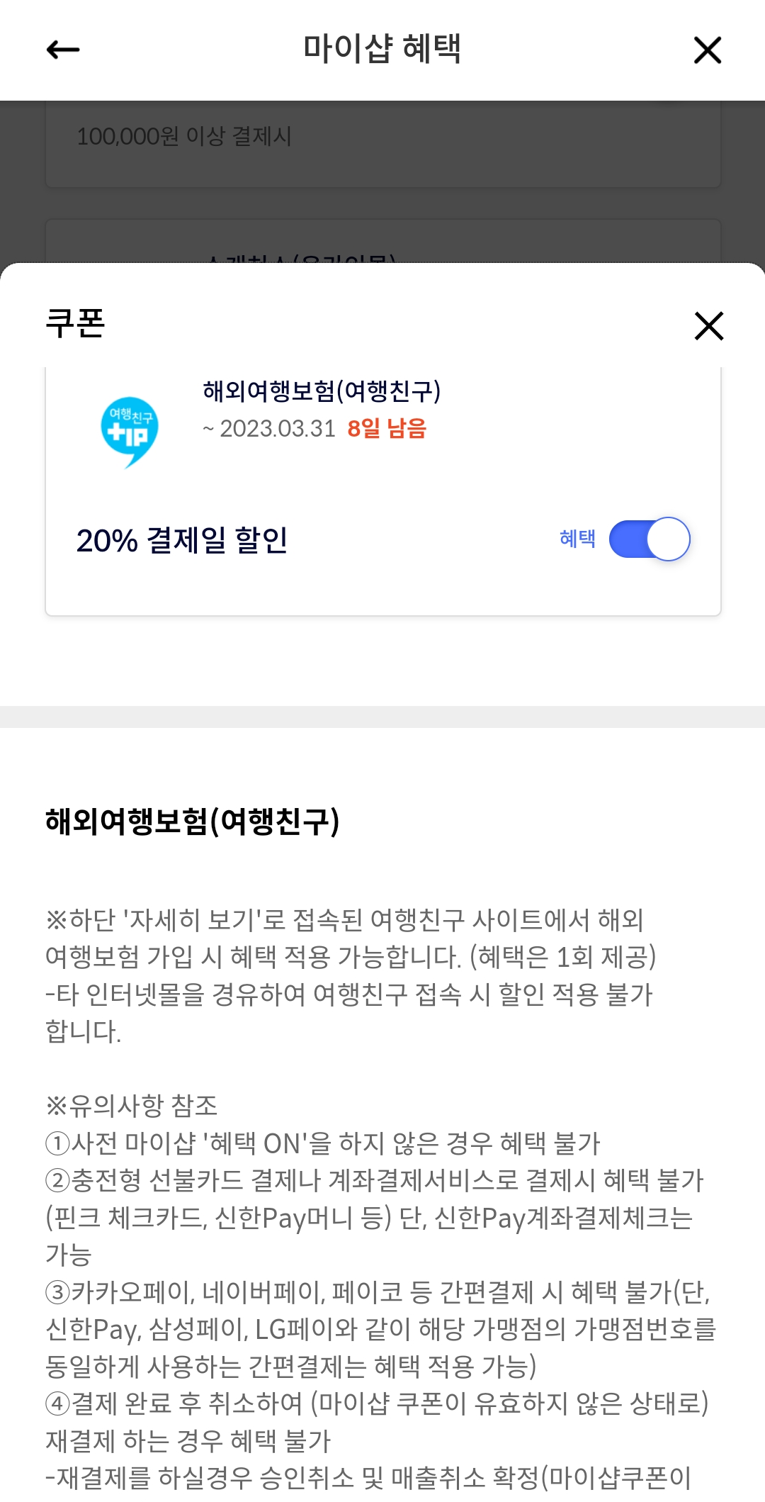 위의 사진처럼 신한플레이에서 마이샵 혜택을 들어가시면 여행친구에서 보험 가입할 시 20%의 할인 혜택을 제공하는 프로모션을 진행중에 있죠.