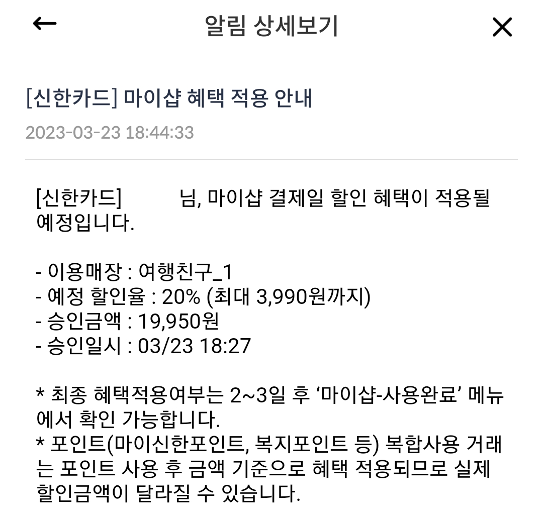 처음에는 19,950원으로 결제가 되길래 아니 뭐지 사기당한건가,,, 했는데 마이샵 혜택이라는게 조금 늦게 반영이되더라고요! 결제하고 좀 기다리니 할인 예정 알림까지 보내줘서 저는 약간은 저렴하게 보험을 가입해 해외여행을 즐겼습니다.