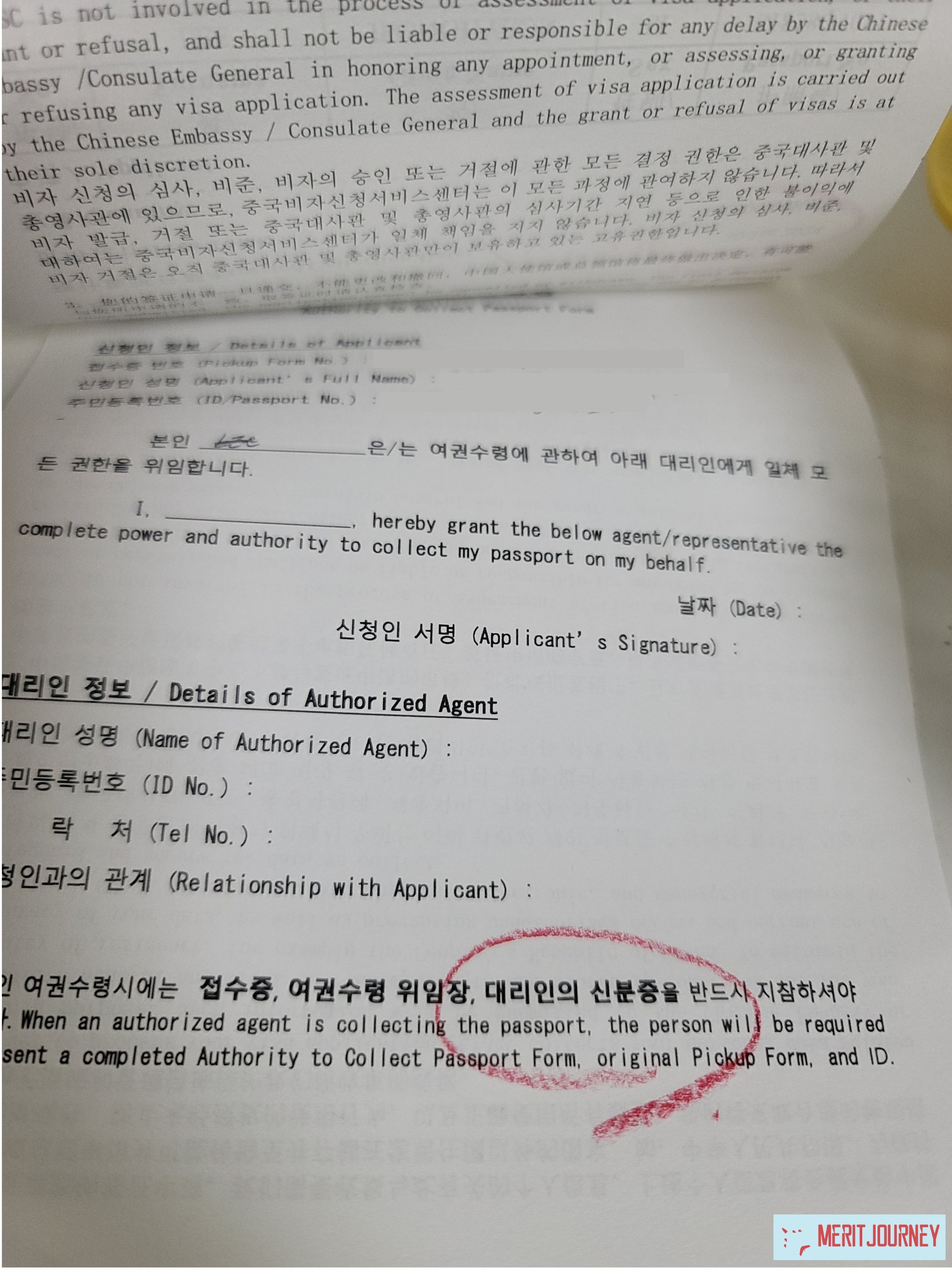 특별한 이유로 개인적으로 오실 수 없는 경우, 공증된 위임장과 함께 여권을 대신 수령할 사람에게 맡길 수 있습니다.