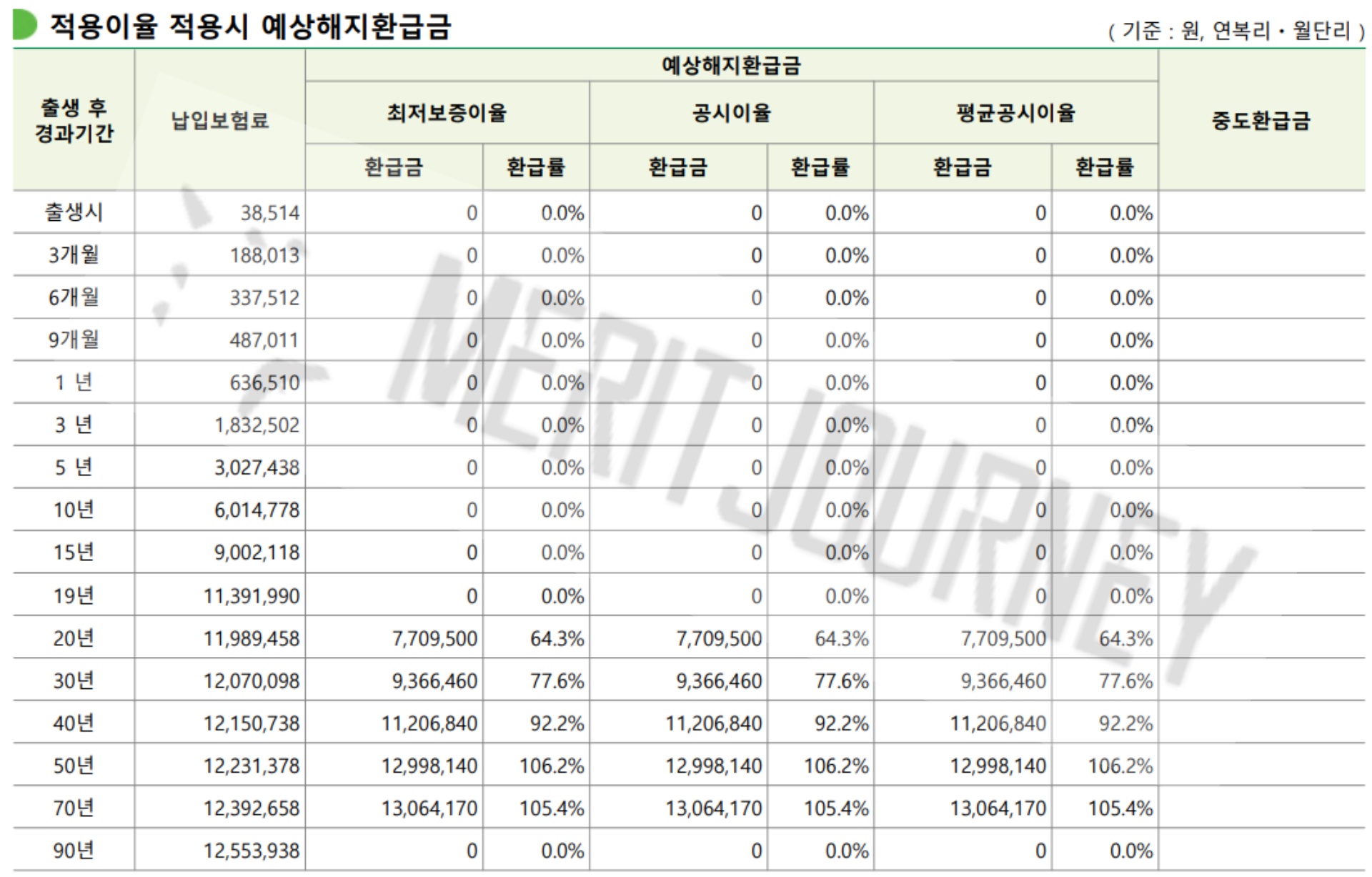 해지환급금같은 경우, 한국과 유사하게 완납되는 시기인 25년전까지는 환급금의 양이 적은것을 볼 수 있습니다.