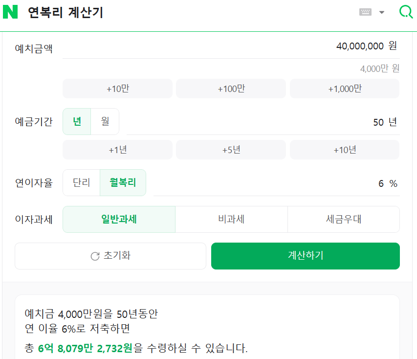네이버에서 단순히 예금계산만 하더라도 4천만원의 50년 만기 시 예상되는 금액은 약 7억 원 정도입니다.