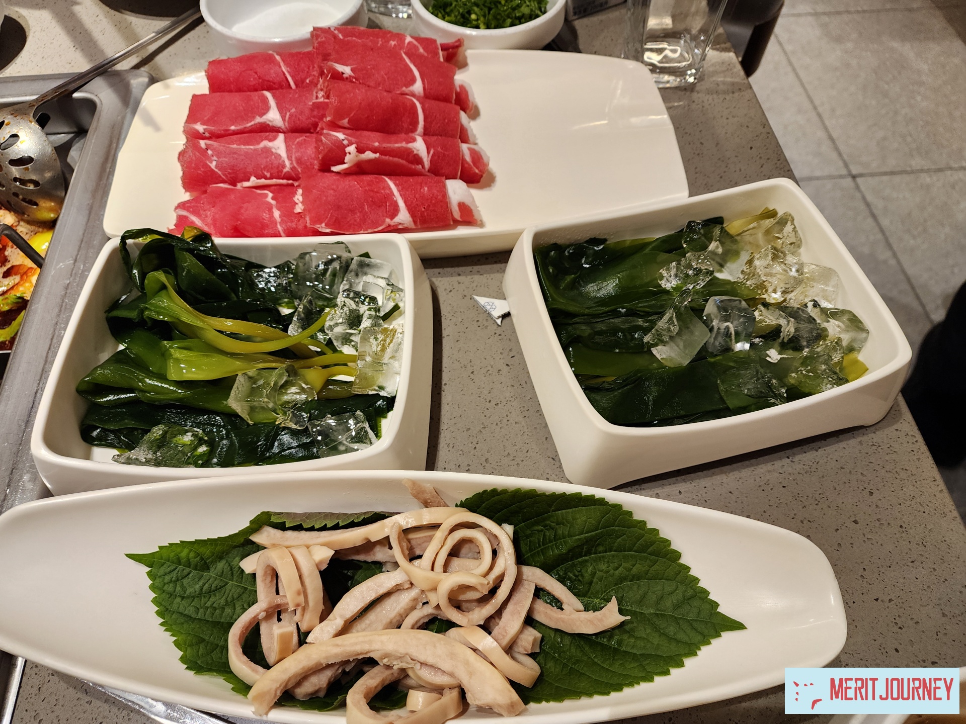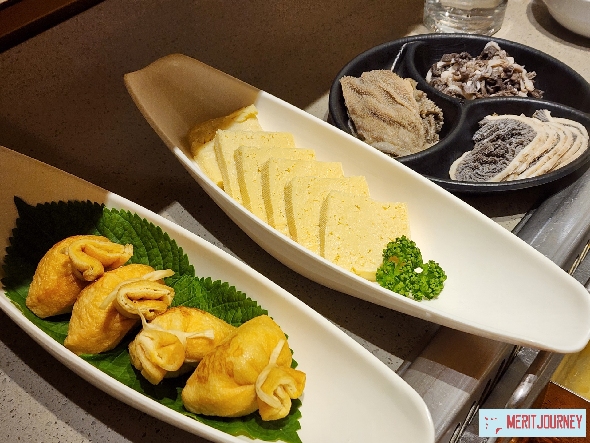 새우완자, 팡가시우메기, 두부모둠, 두유피튀김, 야채모둠, 루로우판, 우삼겹, 돈삼겹, 8초미역줄기 등을 시켰는데요,
