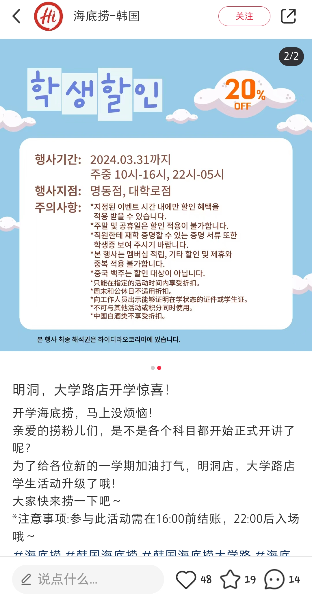 2024년 3월 31일까지는 주중 10~16시/ 22~05시까지 20%학생할인이 있습니다.