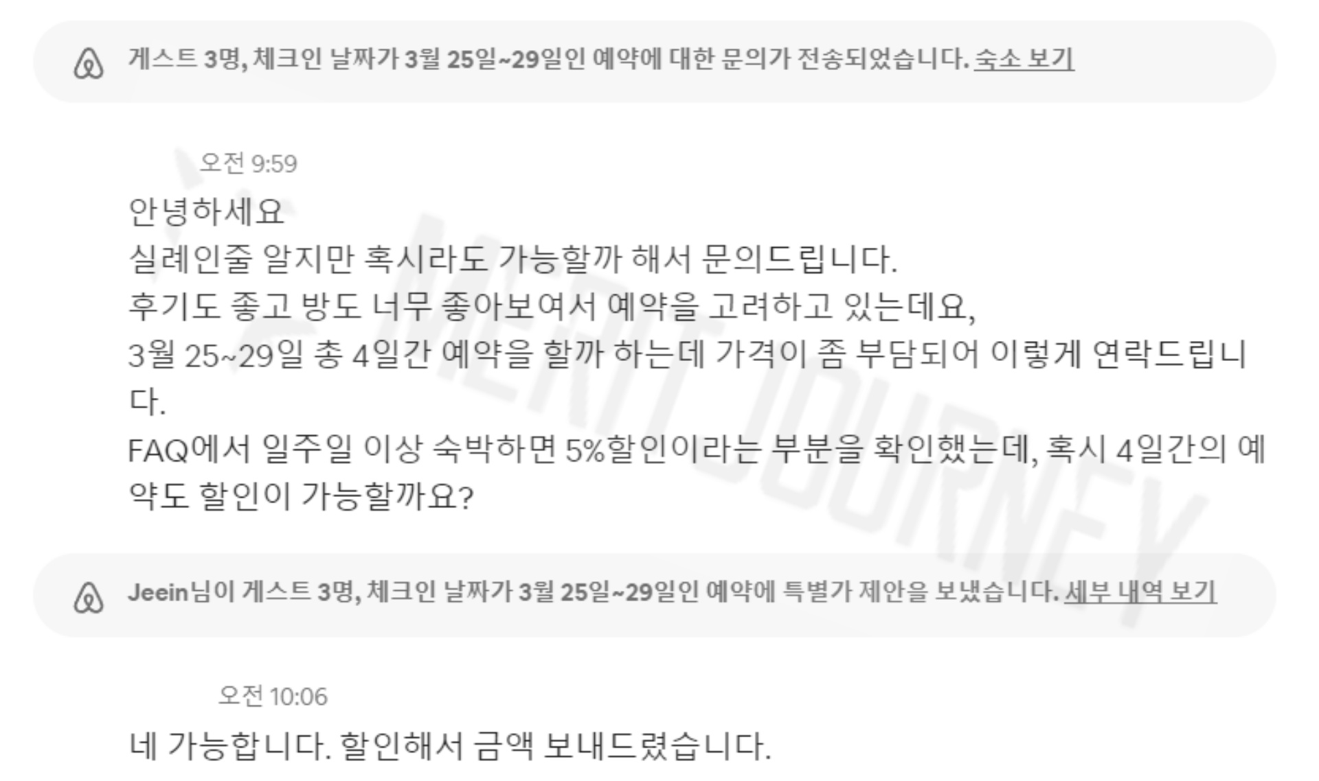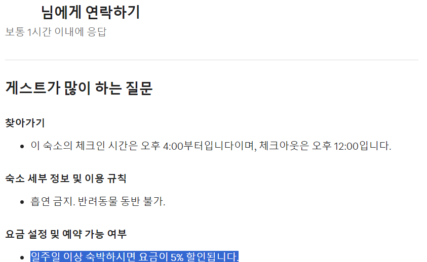 여기서 일주일 이상 숙박시 5% 할인을 보고 그래도 이 호스트는 조금의 협상 여지가 있겠다 싶어 연락을 드렸습니다.