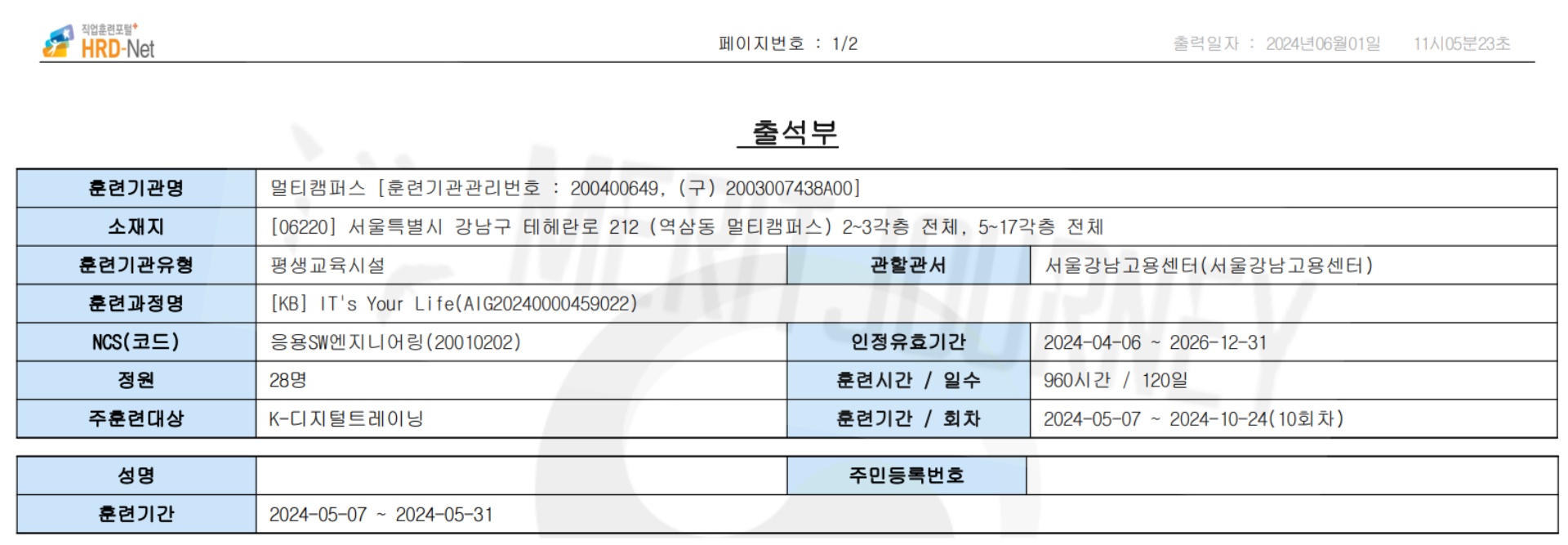 제가 제출한 서류 중 출석확인 증명서는 다음과 같이 생겼습니다.