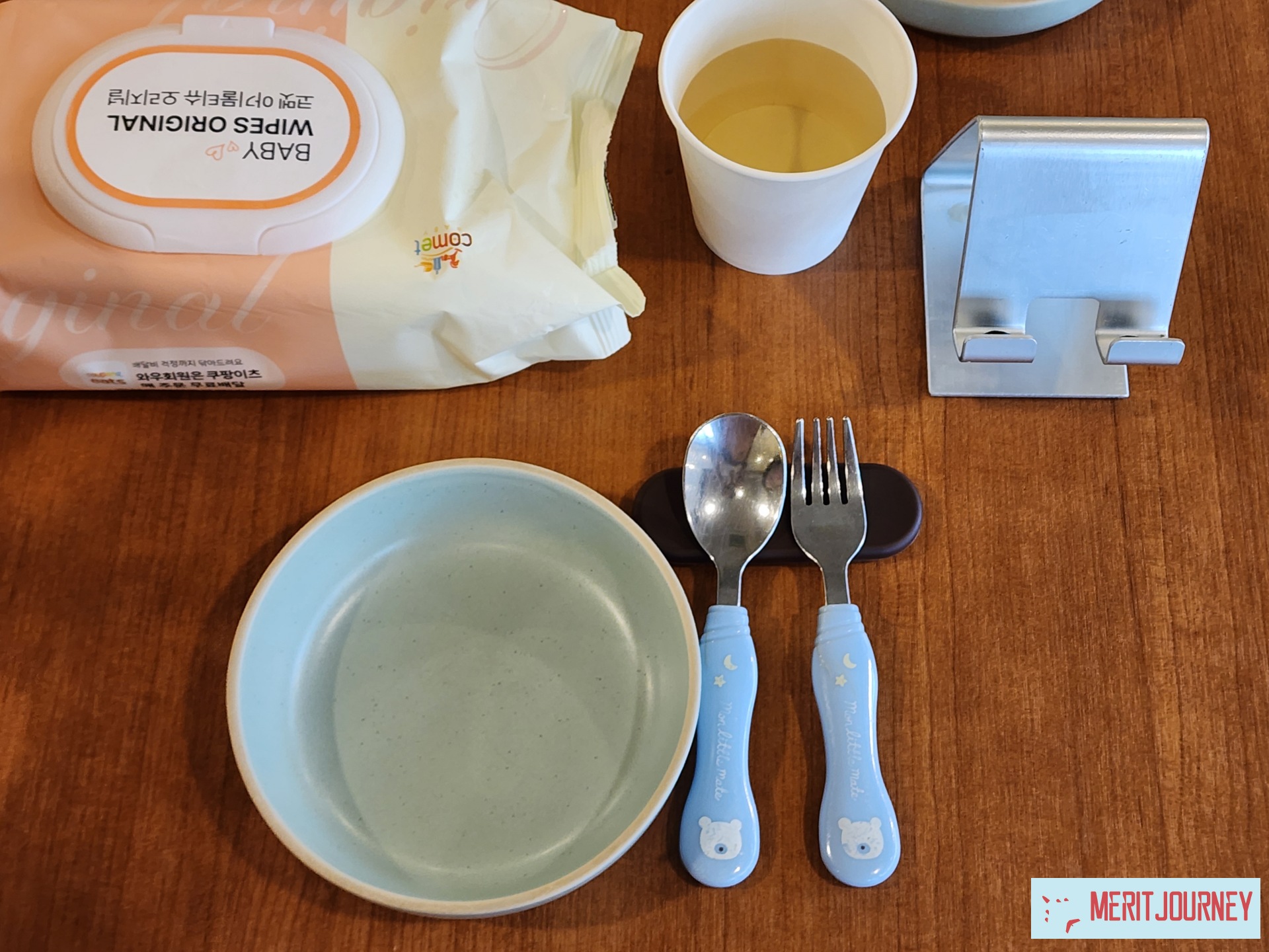 1) 아이들을 위한 핸드폰 거치대와 물수건을 준비해두었습니다.