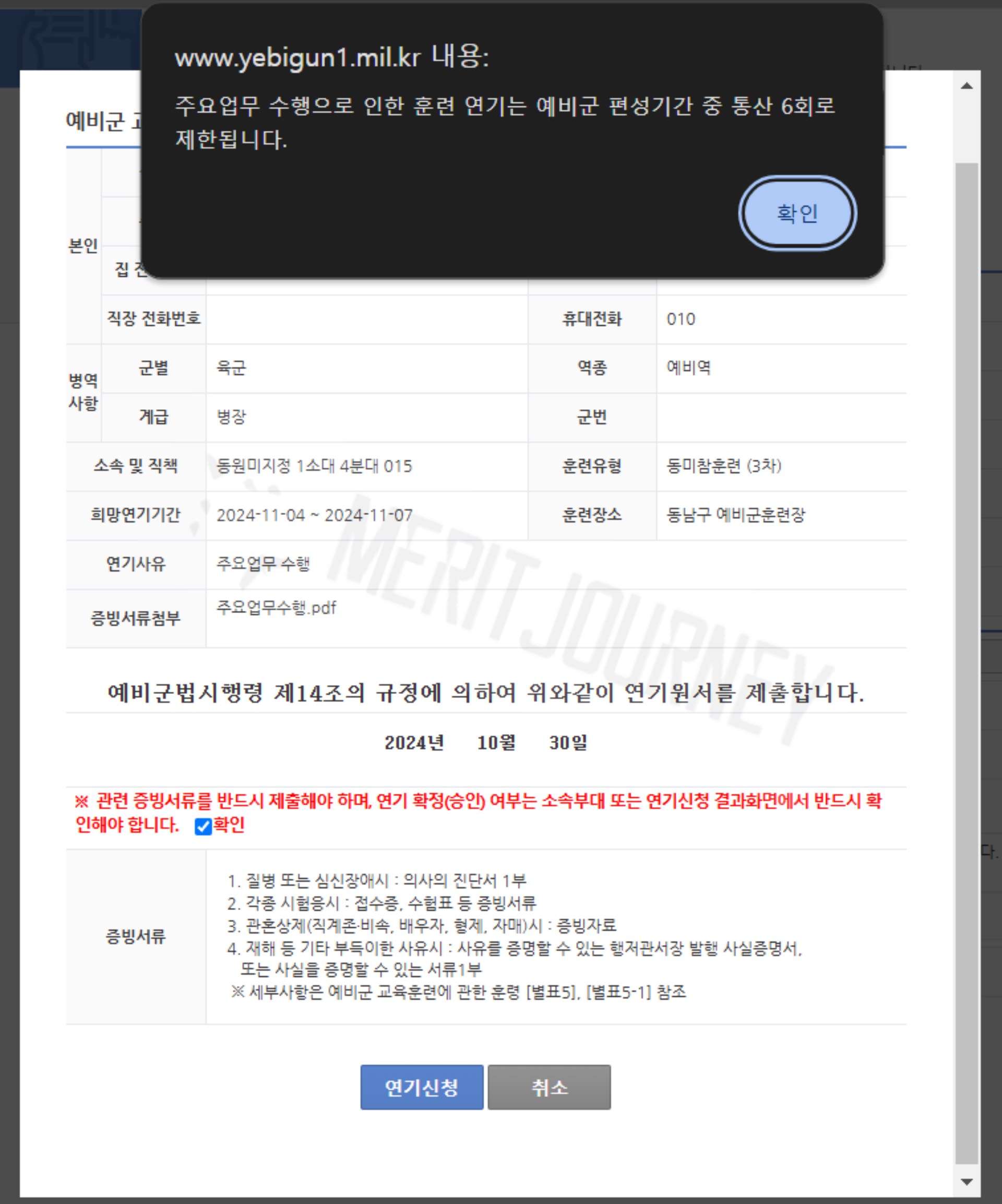 다만, 신청을 하기 위해서는 '주요업무 수행 확인서'라는 서류가 필요합니다. 해당 양식은 공식 홈페이지에서 다운로드할 수 있으며, 빠짐없이 작성하면 됩니다. 이후 예비군 웹사이트에서 증빙 서류를 첨부하면 신청은 끝입니다.