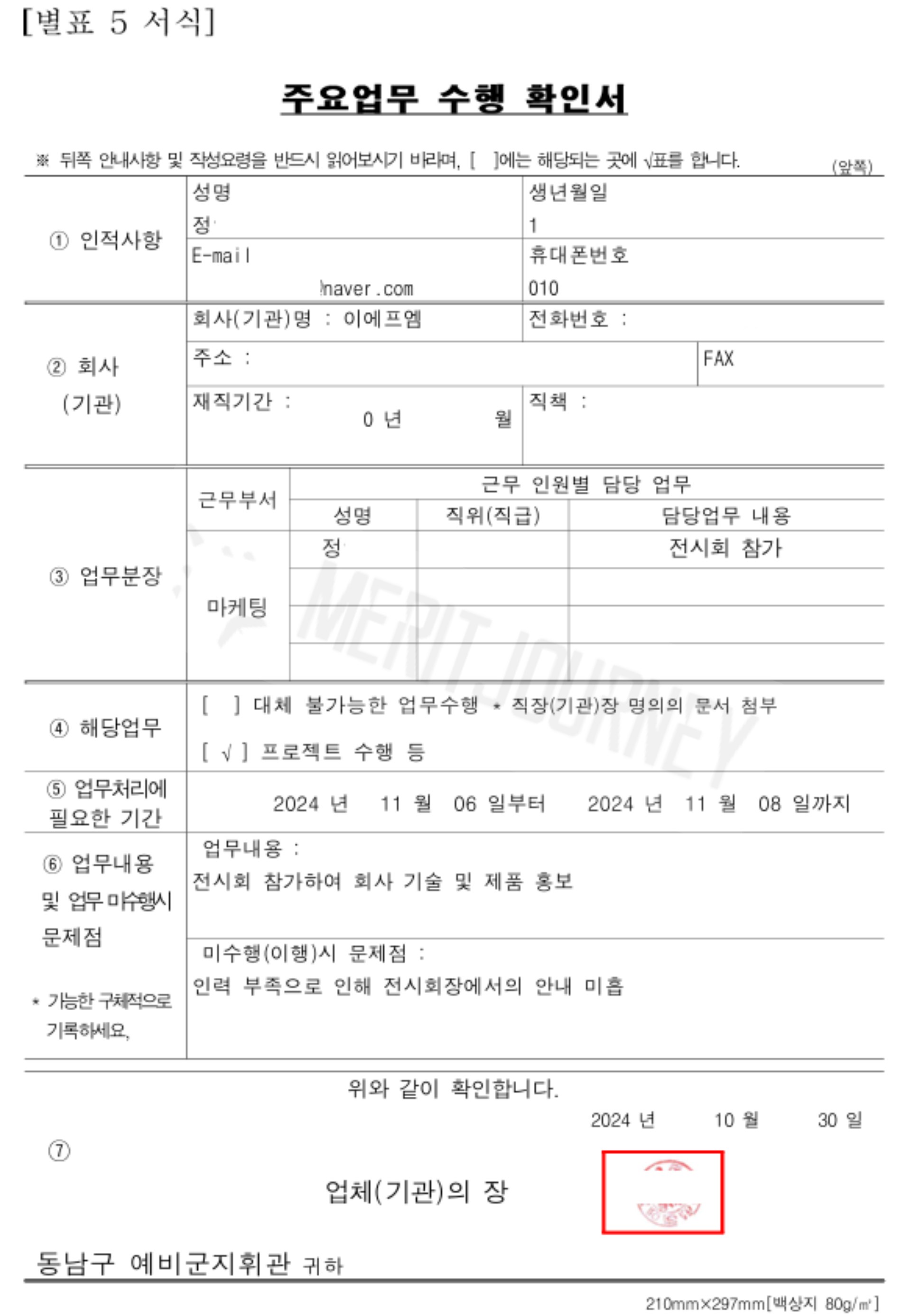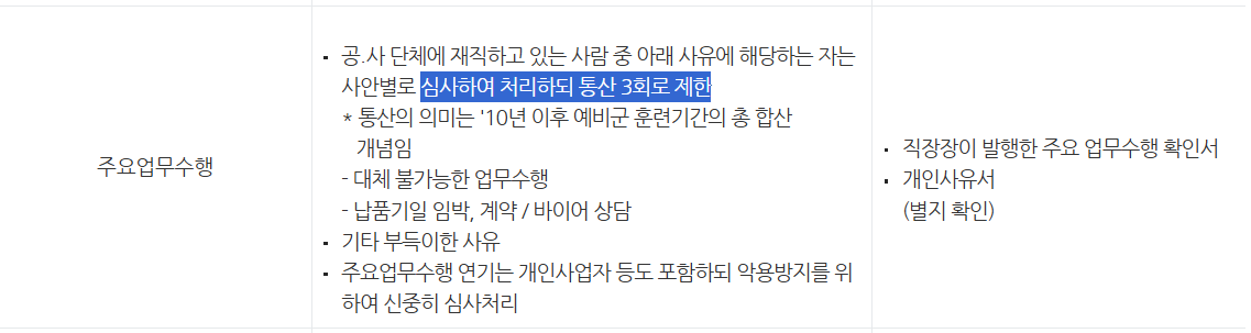 '주요업무'에 대한 명확한 정의는 없습니다. 예비군 동대장님께 여쭤보니, 중요한 일이라고 생각되면 주요업무로 간주할 수 있다고 하더군요. 그러나 남용은 금물입니다. 아래 주의사항에서 자세히 설명하겠습니다.