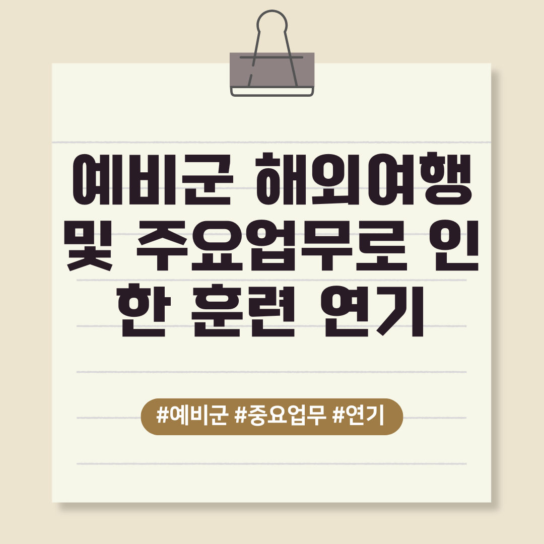 해외여행으로 인한 훈련 연기 방법은 정말 간단합니다. 훈련이 예정된 기간에 해외에 있으면 자동으로 연기 처리가 됩니다. 훈련 마지막 날 출국하는 경우는 어떻게 될지 확실하지 않지만, 훈련 기간 중 해외에만 있으면 연기 처리가 됩니다.
