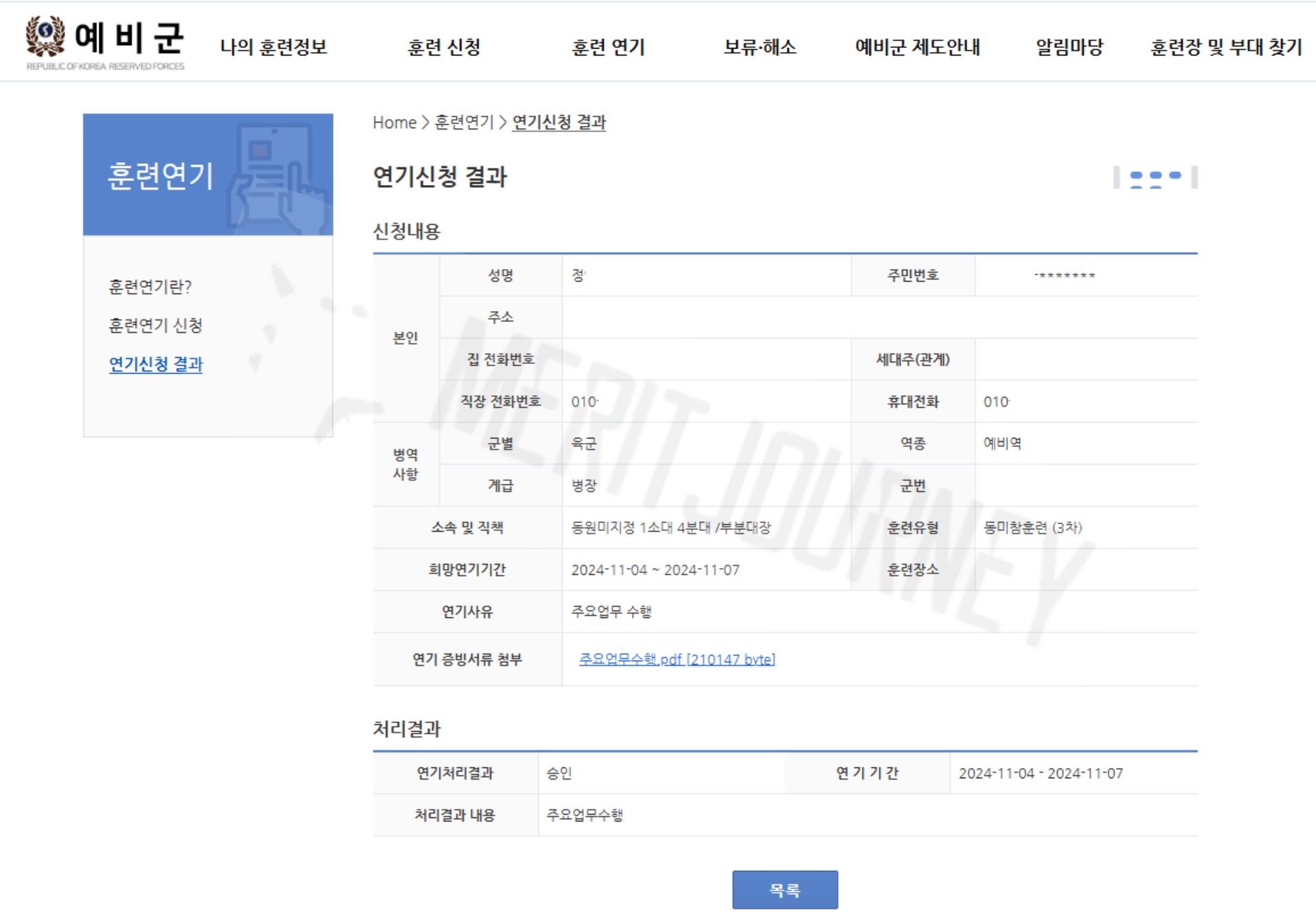 아래는 주요업무 수행으로 인한 예비군 연기 신청이 승인된 걸 볼 수 있습니다. 승인까지는 약 3일 정도 소요됐던 것 같습니다. 혹시 승인이 나지 않으면 어쩌나 싶어 3일째에 전화를 드렸더니, 30분도 지나지 않아 바로 승인됐습니다.
