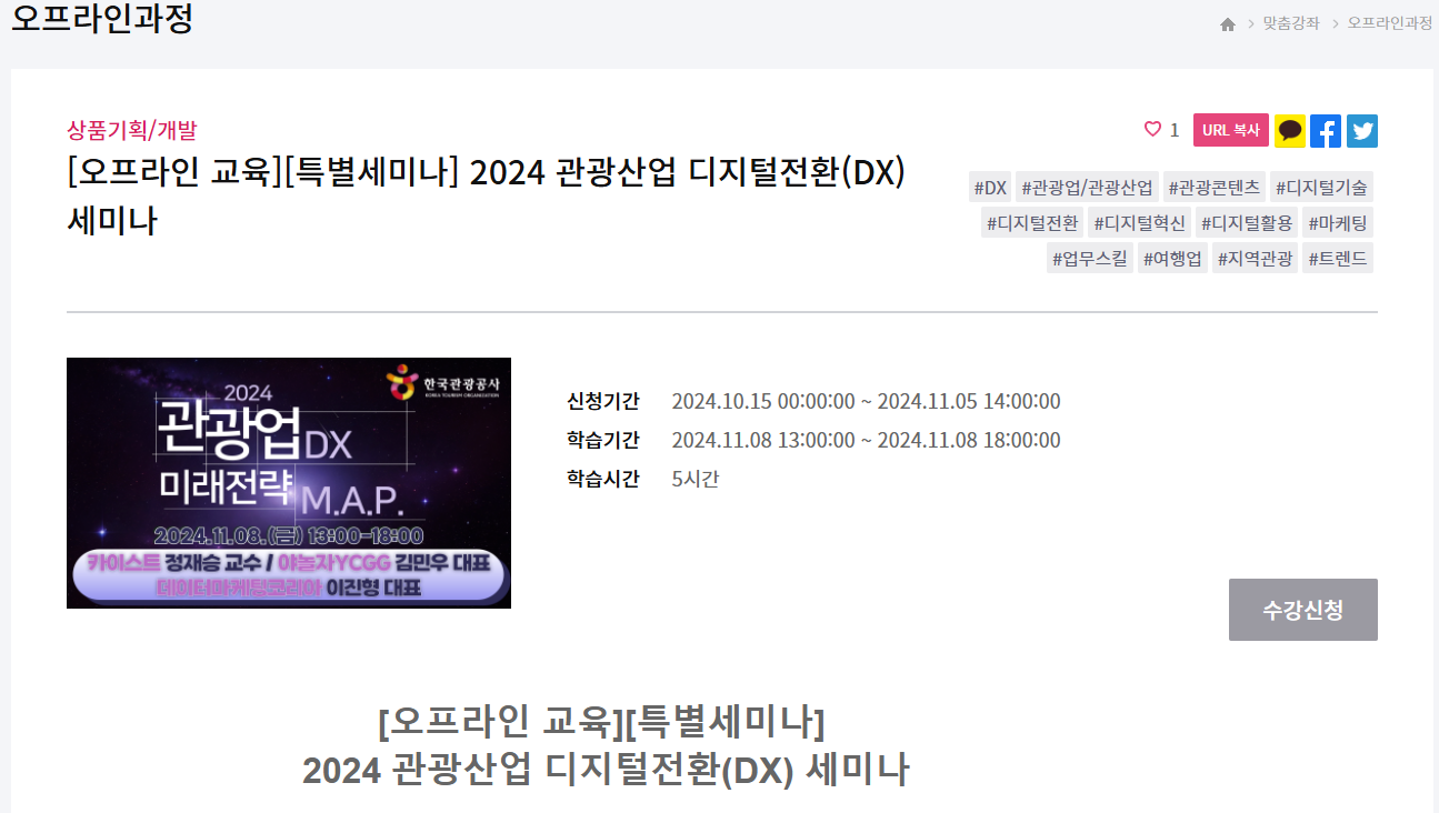 [오프라인 교육][특별세미나] 2024 관광산업 디지털전환(DX) 세미나 이렇게 공식 수강신청페이지가 열리면 로그인 후, 수강신청만 하면 됩니다.