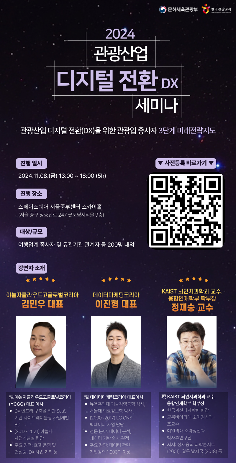 최근에 제 본래 전공과 관련된 교육을 받고 왔습니다. 한국관광공사에서 주최하고, 데이터마케팅코리아(이하 데마코)에서 주관하는 2024 관광산업 디지털 전환 DX 세미나였습니다. 사실 이 주제도 좋았지만 저는 카이스트의 정재승 교수님께서 나오신다는말에 해당 교육이 열리자마자 바로 신청했었습니다. 그리고, 2023년에 데마코 교육을 여러번 들었는데 다 가치있는 교육이었기 때문에 더 신뢰하고 신청을 했었네요.