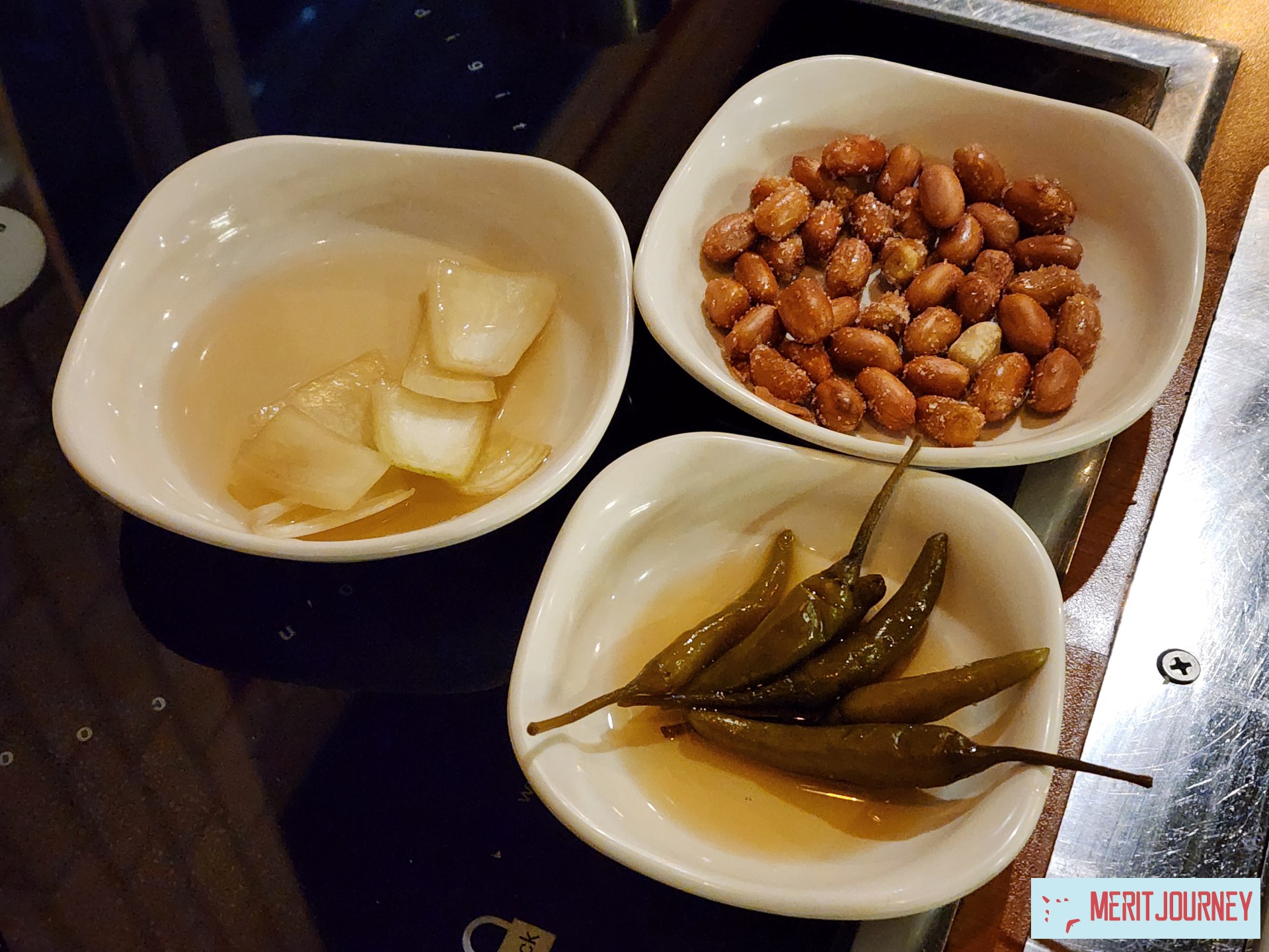 기본 상차림은 양파, 고추, 땅콩이 나옵니다.
